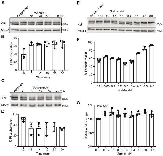 Cell-substrate adhesion enhances Abi phosphorylation. (A,B) Effect of adhesion on Abi phosphorylation. Suspension grown cells were allowed to adhere in Petri dishes and then lysed at indicated time points, and cell lysates were analyzed by Western blotting. The intensity of the upper Abi band (*) increases after adhesion. Quantitation of lane band intensities (intensity of “upper bands”/total band intensity; mean ± SD, n = 3, p = 0.0082, Ordinary one-way ANOVA) confirms increased intensities of phosphorylated Abi bands after adhesion (B). (C,D) Effect of de-adhesion on Abi phosphorylation. Cells grown in adhesion on Petri dishes were detached by a jet of medium from a 10 mL pipette, collected and maintained in suspension (approx. 2 × 106 cells/mL) by shaking at 120 rpm. Cell lysates were analyzed by Western blotting. Quantitation of lane intensities (mean ± SD, n = 3, p = 0.19, Ordinary one-way ANOVA) confirms a loss of phosphorylated Abi bands (*) intensity (D). (E–G) Effect of various sorbitol concentrations on Abi phosphorylation. Medium from cells was replaced with PB containing various concentrations of sorbitol. After 5 min cell lysates were prepared in sample buffer and analyzed for Abi (E) band shifts. Abi phosphorylation is abolished at 400 mM sorbitol and induced with >400 mM sorbitol (F; mean ± SD, n = 3, p = 0.0001, Ordinary one-way ANOVA) without affecting total Abi concentration (G; mean ± SD, n = 3, p = 0.3, Ordinary one-way ANOVA).