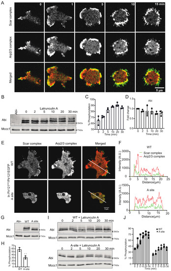 Scar/WAVE complex activation completely depends on GTP-bound Rac1 interacting with the Pir121 subunit [3,39,40]. We, therefore, examined Abi phosphorylation in cells with the A-site mutation in Pir121, which cannot bind Rac1 [3,4]. This makes the cells excellent for testing whether phosphorylation is upstream or downstream of activation—signalling pathways upstream will be unaffected, whereas activation-dependent processes will be lost. As expected, A-site mutants activated neither the Scar/WAVE nor the Arp2/3 complex (Figure 4E,F), confirming the inactive state of the Scar/WAVE complex. Abi phosphorylation was substantially diminished in the A-site mutant (Figure 4G,H). Furthermore, treatment with latrunculin A, which causes active Scar/WAVE complex to accumulate through an unknown mechanism [3,4], greatly increased the abundance of phosphorylated Abi in normal cells, but only slightly in A-site mutant cells (Figure 4I,J). We note that latrunculin caused wild type Abi to be hyperphosphorylated, producing a higher band that was not seen in normally stimulated cells. It is not clear whether this reflects a second phosphorylation on S166, 168, 169, or new phosphorylation on a different site. Taken together, these results confirm that Abi phosphorylation is a result of Scar/WAVE complex activation.