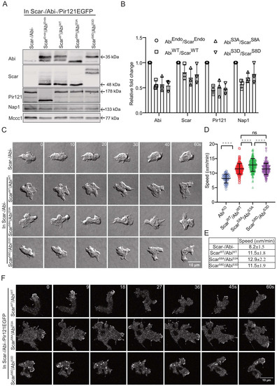 We, therefore, tested the combined effects of Scar/WAVE and Abi phosphorylation on the activation of the complex and cell migration. To examine the cells’ physiological behaviour accurately, we generated a complex parent. We created a Scar-/Abi- double knockout and then replaced the endogenous Pir121 with a single copy Pir121-eGFP (Scar-/Abi-/Pir121-eGFP). This yielded a strain in which the Scar/WAVE complex could be followed without tags on either Scar or Abi, or competition with the endogenous proteins, and in which the complex was homogeneously GFP-tagged, giving a high signal/noise ratio in microscopy.