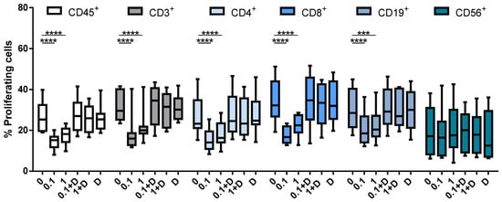 Box plots showing the percentage of proliferating cells in CFSE-stained PBMCs. Cells were stimulated with PHA at 0.25 μg/mL for 96 h. No cladribine, cladribine at 0.1 μM or 1 μM in the presence or absence of 250 μM of deoxycytidine was added for the last 48 h. Percentages of gated CD45+, CD3+, CD4+, CD8+, CD19+ and CD56+ that lost basal CFSE basal expression are shown. The gating strategy for this experiment is shown in Supplementary Figure S1. One-way ANOVA with repeated measures followed by Dunnett’s multiple comparisons test was performed comparing every mean value to a control mean (0 group). *** p-value ˂ 0.001, **** p-value ˂ 0.0001. (N = 10). Cladribine concentrations (μM) are plotted on the x axis. D: deoxycytidine.