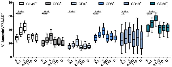 Effect of cladribine on apoptosis of PBMCs. Isolated PBMCs were stimulated with 5 μg/mL PHA and treated with no cladribine, 0.1 or 1 μM of cladribine, in the presence or absence of 250 μM of deoxycytidine, for 16 h. Percentages of gated CD45+, CD3+, CD4+, CD8+, CD19+ and CD56+ that show positivity for Annexin V and negativity for 7AAD are represented. Gating strategy for this experiment is shown in the Supplementary Figure S2. One-way ANOVA with repeated measures followed by Dunnett’s multiple comparisons test was performed, comparing every mean value to a control untreated group mean (0 group). * p-value ˂ 0.05, **** p-value ˂ 0.0001. (N = 10). Cladribine concentrations (μM) are plotted on the x axis. D: deoxycytidine.
