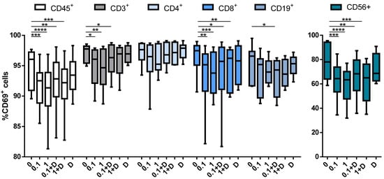 Box plots showing the impact of cladribine on the activation of PBMCs subpopulations. PBMCs were stimulated with PMA plus ionomycin for 4 h with no cladribine (untreated condition), 0.1 μM or 1 μM of cladribine, in the presence or absence of 250 μM deoxycytidine. Activation was represented as the percentage of gated CD45+, CD3+, CD4+, CD8+, CD19+ and CD56+ that showed positivity for CD69. The gating strategy for this experiment is shown in the Supplementary Figure S3. One-way ANOVA with repeated measures followed by Dunnett’s multiple comparisons test was performed, comparing every mean value to a control mean (0 group). * p-value ˂ 0.05, ** p-value ˂ 0.01, *** p-value ˂ 0.001, **** p-value ˂ 0.0001. (N = 10). Cladribine concentrations (μM) are represented on the x axis. D: deoxycytidine.