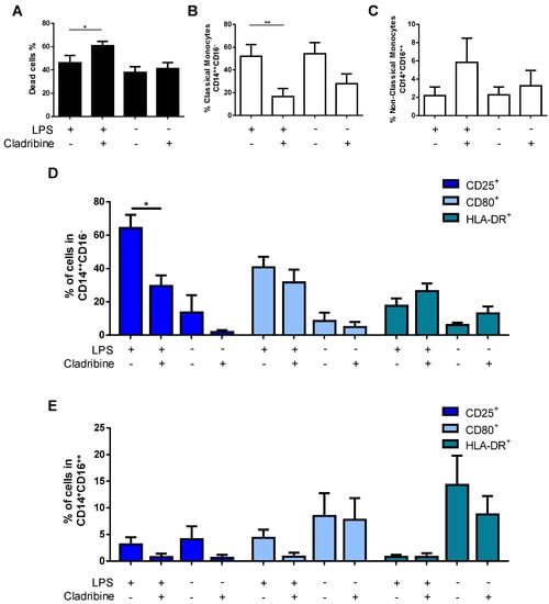 Effect of cladribine on the activation of monocytes. Purified monocytes were treated with 0.1 μM cladribine for 24 h, in the absence or presence of LPS (100 ng/mL), and activation was assessed by flow cytometry, by means of immunostaining against surface activation markers in classical and non-classical monocytes. (A) Cell death of total CD14+-monocytes was assessed by flow cytometry using a fixable viability dye. After selecting alive cells, monocytes were gated on classical and non-classical monocytes based on the expression of CD14 and CD16. The effect of cladribine in the percentage of (B) classical (CD14++CD16−) and (C) non-classical (CD14+CD16++) monocytes was evaluated. The effect of cladribine over monocyte activation determined in (D) classical, and (E) non-classical monocytes, is shown as the percentage of the corresponding monocyte phenotype expressing CD25, CD80, and HLA-DR. The gating strategy for this experiment is shown in Supplementary Figure S4. Mann–Whitney tests or Student’s t-tests were applied to compare the mean value of LPS + cladribine to a control mean (LPS group). * p-value ˂ 0.05, ** p-value ˂ 0.01. Data are expressed as the mean. Error bars represent the SEM, (N = 5). LPS: lipopolysaccharide.