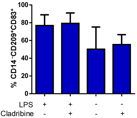 Aiming to examine the potential immunomodulatory action of cladribine on DCs, we investigated the effect of cladribine on the maturation of DCs. ImDCs were treated with cladribine (0.1 µM) in the presence or absence of LPS (100 ng/mL) for 24 h. Then, cells were harvested and stained with fluorochrome-conjugated mAbs against the maturation marker CD83, and the lineage markers CD209 (DC-sign) and CD14 (monocytes). Flow cytometry analysis showed that LPS tended to increase the frequency of mDCs (CD83+CD209+CD14−); however, the addition of cladribine did not show any effect on the maturation process (Figure 6).