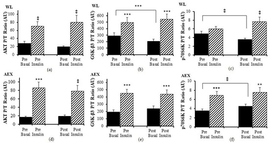 Skeletal muscle Akt, GSK-3β and p70S6K phosphorylation, and total protein expression ratio during basal (solid) and insulin-stimulated (striped) pre and post WL (a–c) and AEX (d–f). Paired t-tests between pre basal vs. pre insulin, post basal vs. post insulin, and pre vs. post basal analyses within WL and within AEX were performed using the SPSS software version 27 (SPSS Inc., Chicago, IL, USA). ** p ≤ 0.01; *** p ≤ 0.001, ‡ p ≤ 0.005.