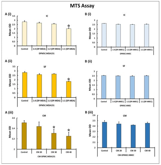 Both MDA231 cells and HMECs incubated for 24 h and 48 h either with CM-DPMSCs or the cellular component of DPMSCs did not show any change in their phenotypes (data not shown). Rather, as shown in Figure 1A(i),B(i), the co-cultured MDA231 cells in the IC setting did not show any change in proliferation at 1:2 and 1:4 concentrations for both HMECs as well as MDA231 cells. However, at a 1:1 concentration, the MDA231 cells showed a significant reduction (p < 0.05) in proliferation as compared to the untreated control. As expected, this effect was not observed for HMECs treated under similar conditions with DPMSCs (Figure 1A(i)). A similar phenotype was observed when the cells were co-cultured in the SF setting. As shown in Figure 1A(ii),B(ii), the cellular ratios at 1:2 and 1:4 for DPMSCs to MDA231 cells/HMECs did not exhibit any change in the growth behavior between the control and various treatment settings. However, as observed in the IC setting, the cellular ratio at 1:1 for DPMSCs to MDA231 cells in the SF setting also showed a significant reduction (p < 0.05) in the MDA231 proliferation as compared to the untreated control. As shown in Figure 1A(ii), this phenotype was not observed in DPMSC-treated HMECs.