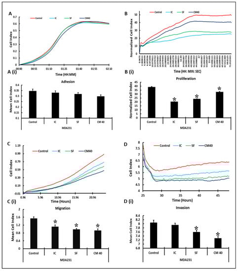 As shown in Figure 2A, the adhesion of MDA231 cells did not change significantly when treated with DPMSCs at a ratio of 1:1 in both IC as well as in SF settings in xCELLigence RTCA assays. However, treatment with 40% CM-DPMSCs reduced the adhesion of MDA231 cells significantly (p < 0.05) as compared to IC, SF, and untreated control groups. Figure 2A(i) shows the mean cell index recorded 2 h after the start of the experiment, comparing the untreated control MDA231 cells with different treated groups.