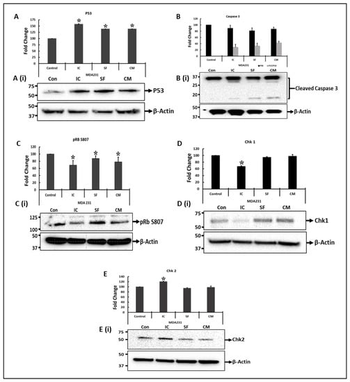 Immunoblotting of cell-cycle-associated proteins: Immunoblotting of selected proteins involved in important cellular functions was performed on MDA231 cells after treatment with DPMSCs. Expression levels of p53 increased significantly in IC and SF settings, as well as after treatment with 40% CM of DPMSCs (A). After treatment, caspase-3 cleaved into P17 and P19 components (B). The phosphorylation of the Rb protein at S807, as well as the total levels of Chk1 proteins, decreased significantly in IC settings as compared to control, SF and CM (C,D), whereas Chk2 protein expression levels increased significantly in MDA231 cells after treatment with DPMSCs (E). Bars at (A(i), B(i), C(i), D(i), and E(i)) represent the density of the bands, measured using Image Lab® software. Values are represented as means ± SE, * p < 0.05.