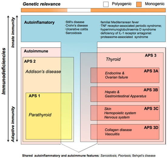 Classification of immunodeficiencies adapted from Neufeld and Blizzard (1980) based on clinical criteria only. The genetic origin of autoinflammatory and autoimmune alterations is considered monogenic (orange in the genetic relevance bar) when they are well compartmentalized, but compatible with polygenic models (white in the genetic relevance bar) when the immune disease shares components from innate and adaptive immunity. Different autoimmune diseases often co-occur in the same patient (autoimmune polyendocrine syndrome, APS); there are different APS types, APS1 and 2 involve Addison’s disease (yellow box), while APS3 (red box) involves thyroid disease (both hypothyroidism and hyperthyroidism). APS3 patients are subclassified depending on the tissues of origin of the co-occurring APS pathologies; they typically have co-occurring endocrine and ovarian (APS3A); hepatic and gastrointestinal (APS3B); skin, hematopoietic and nervous system (APS3C); or collagen and vasculitis (APS3D) autoimmune diseases.