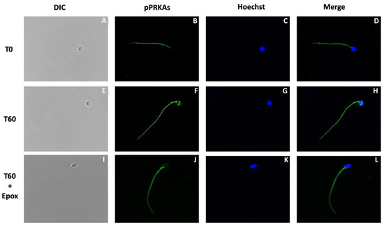 The next experiment was designed to determine the effect of epoxomicin on the subcellular localization of pPRKAs in human sperm (Figure 3). Sperm incubated in NCM (T0) presented pPRKAs labeled exclusively in the flagellum (Figure 3B with less intensity and a lower percentage than in sperm incubated in CM for 60 min (T60, Figure 3F) (65 ± 9% vs. 91 ± 2, respectively. p < 0.01). Although most of the sperm incubated in CM for 60 min presented labeling in the flagellum, only 24 ± 6% had labeling in the equatorial segment of the head (Figure 3F). Sperm incubated for 60 min in the presence of epoxomicin (T60 + Epox, Figure 3J), presented labeling on the flagellum (86 ± 8%) similar to that observed in the control without inhibitor and with the same fluorescence intensity. However, these sperm did not show labeling in the equatorial segment of the head (Figure 3J).