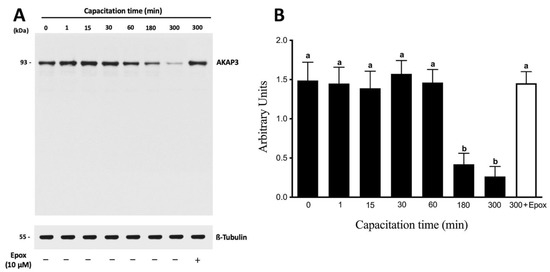 Next, we performed a capacitation kinetic of the protein levels of AKAP3. AKAP3 protein levels remained constant for 60 min of incubation in CM (Figure 5A). Subsequently, at 180 and 300 min of incubation, a significant decrease in AKAP3 protein levels was observed (Figure 5B; p < 0.01). At the end of the incubations (180 and 300 min), no significant decrease in the motility or viability of the sperm was detected (data not shown), indicating that the decrease in AKAP3 levels was not due to sperm death. Moreover, the protein levels of AKAP3 were evaluated during capacitation in the presence of 10 µM epoxomicin (Figure 5A, last right lane). Those sperm that were incubated for 300 min in the presence of epoxomicin did not show a decrease in AKAP3 protein levels (Figure 5B; p < 0.01). These results strongly suggest that the decrease in AKAP3 protein levels was due to proteasome degradation during human sperm capacitation. However, the degradation of AKAP3 started at 180 min, and, taking into account that the effect of the proteasome on PRKA activity was observed after 30 min, this degradation would not explain the regulation of the PRKA activity by the proteasome.