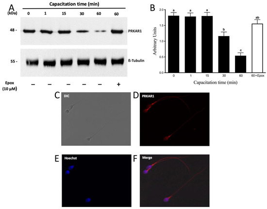 The degradation of PRKAR1 is dependent on the sperm proteasome. Total protein extracts were obtained from sperm incubated at different times with 0.1% DMSO or for 60 min with 10 µM epoxomicin (Epox). (A) The level of PRKAR1 was detected by Western blot using an anti-PRKAR1 antibody. (B) For the densitometric analysis, β-tubulin was used as a loading control. Bars represent the mean ± S.E.M of seven different experiments. Different letters indicate statistically significant differences (p < 0.01) between groups. (C–F) For subcellular localization of PRKAR1, sperm were incubated under capacitation conditions for 1 min. Then, the cells were fixed and labeled with a primary anti-PRKARI antibody (D, red) and with Hoechst (E, blue). DIC: differential interference contrast (A). Merge: merged image of PRKAR1 and Hoechst (F; red and blue).
