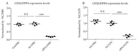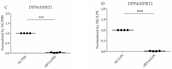 For siRNA transfection, the Lipofectamine™ RNAiMAX Transfection Reagent (Invitrogen, Carlsbad, CA, USA) was used. The cells were transfected with siRNA at a 60% confluence, according to the manufacturer’s protocol, and then challenged with LPS at 72 h after siRNA treatment. The selective silencing of CD26/DPP4 was confirmed using flow cytometry analysis and quantitative PCR.