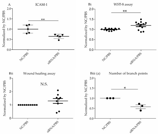 Confirmation studies of HLMVECs under baseline conditions. (A) Assessment of ICAM-1 expression level on HLMVECs. HLMVECs were transfected with non-specific or DPP4-specific siRNA for 72 h, and then challenged with PBS for 18 h. ICAM-1 expression on HLMVECs was measured by mean fluorescence intensity (MFI) using flow cytometry analysis. ICAM-1 levels in cultured HLMVECs after siRNA treatment followed by PBS challenge are shown. * p < 0.05, ** p < 0.01. The values are means ± SD of three or more independent experiments. N.S., Not significant; NC, Non-specific control; siRNA, DPP4 siRNA. (B) Assessment of regenerative process under baseline conditions. (i) WST-8 assay to evaluate proliferative capacity of HLMVECs. HLMVECs were transfected with non-specific or DPP4-specific siRNA for 72 h, and then challenged with PBS for 18 h. Proliferation was assessed using a WST-8 assay. (ii) Wound healing assay to evaluate migratory ability of HLMVECs. HLMVECs were transfected with non-specific or DPP4-specific siRNA for 72 h, and then challenged with PBS for 18 h. HLMVEC migration was measured by wound healing assay. (iii) Tube formation assay to evaluate the lumen forming ability of HLMVECs. The lumen forming ability of HLMVECs was evaluated by tube formation assay. HLMVECs were transfected with non-specific or DPP4-specific siRNA for 72 h, and then cultured in Matrigel-coated wells, followed by PBS for 6 h. The number (Biii (a)) and lengths of tubes (Biii (b)) formed by the cells were counted by microscopy. * p < 0.05, ** p < 0.01. The values are presented as the mean ± SD of three or more independent experiments. N.S., not significant; NC, non-specific control; siRNA, DPP4 siRNA.