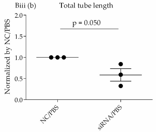 To assess another aspect of endothelial repair, the lumen-forming ability of HLMVECs was evaluated by performing a tube formation assay. After 6 h of seeding the cells on Matrigel-coated wells, the tube formation was quantified by measuring the number and lengths of tubes in the microscopic images of each well. Both the number and lengths of tubes trended toward a reduced level in cells treated with DPP4 siRNA compared to those in negative control samples (Figure 3Biii(a,b).