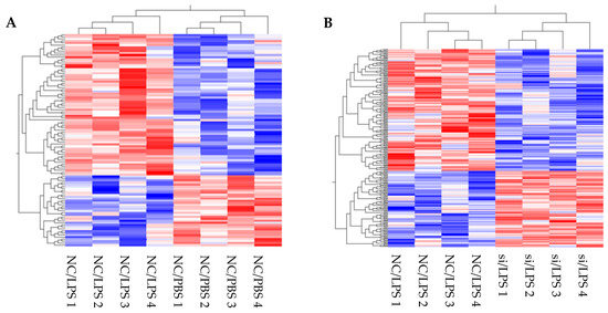 Transcriptomic analysis of HLMVECs with LPS challenge. Heatmap represents the transcriptomic analysis of differentially expressed genes in HLMVECs after LPS stimulation. (A): Negative control siRNA (NC)/LPS vs. NC/PBS, and (B): DPP4 siRNA (siRNA)/LPS vs NC/LPS.