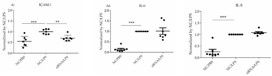 Cultured HLMVECs were treated with an siRNA or vehicle (water) for 72 h, followed by treatment with LPS (1 µg/mL) or vehicle (PBS) for 6 h. The harvested culture medium was centrifuged (500× g for 10 min at 4 °C), and the supernatant was collected for ELISA. Human interleukin (IL)-6 and IL-8 levels were measured using ELISA kits (BioLegend), according to the manufacturer’s protocols.