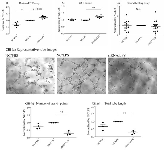 Confirmation studies of HLMVECs after LPS challenge. (A) Assessment of pro-inflammatory parameters. (i) ICAM-1 expression levels on HLMVECs. HLMVECs were transfected with non-specific or DPP4-specific siRNA for 72 h, and then challenged with LPS (1 µg/mL) or PBS for 18 h. ICAM-1 expression on HLMVECs was measured by mean fluorescence intensity (MFI) using flow cytometry analysis. (ii) Release of pro-inflammatory cytokines IL-6 and IL-8. HLMVECs were transfected with non-specific or DPP4-specific siRNA for 72 h, and then challenged with LPS (1 µg/mL) or PBS for 6 h. Secreted cytokine levels in the conditioned media were measured by ELISA, and the values were normalized to that of non-specific siRNA/LPS-treated groups. Levels of both IL-6 and IL-8 were increased by LPS challenge, but no differences were observed between the groups treated with non-specific RNA and DPP4 siRNA. * p < 0.05, ** p < 0.01, *** p < 0.001. Values are means ± SD of three or more independent experiments. N.S., Not significant; NC, Non-specific control; siRNA, DPP4 siRNA. (B) Assessment of monolayer permeability in HLMVECs. Permeability was evaluated by dextran-FITC assay. LPS enhanced monolayer permeability of the HLMVECs. DPP4 siRNA further increased HLMVEC permeability after LPS stimulation. (C) Assessment of regenerative process in HLMVECs after LPS. (i) WST-8 assay to evaluate proliferative capacity of HLMVECs. HLMVECs were transfected with non-specific, or DPP4-specific siRNA for 72 h, and then challenged with LPS (1 µg/mL) or PBS for 18 h. Proliferation was assessed using a WST-8 assay. (ii) Wound healing assay to migratory ability of HLMVECs. HLMVECs were transfected with non-specific, or DPP4-specific siRNA for 72 h, and then challenged with LPS (1 µg/mL) for 18 h. The migratory ability of HLMVECs was measured by wound healing assay. (iii) Tube formation assay to evaluate lumen forming ability of HLMVECs. The lumen forming ability of HLMVECs was evaluated by tube formation assay. HLMVECs, which were transfected with non-specific or DPP4-specific siRNA for 72 h, and were cultured in Matrigel-coated wells, followed by LPS challenge LPS (1 µg/mL) or PBS for 6 h. The number and lengths of tubes formed by the cells were counted using microscopy. The representative tube images (a), the branch number of tubes (b), and the lengths of tubes (c) are shown. * p < 0.05, ** p < 0.01, *** p < 0.001. The values are means ± SD of three or more independent experiments. N.S., Not significant; NC, Non-specific control; siRNA, DPP4 siRNA.