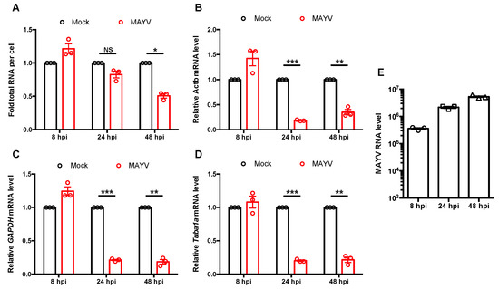 MAYV blocked global transcription during infection. (A–E) A549 cells were infected with MAYV (MOI = 3) for 8, 24, and 48 h, after which total cellular RNA was extracted and quantified using a spectrophotometer (A). Relative levels of ACTB (B), GAPDH (C), Tuba1a (D), and MAYV RNA (E) were measured by qRT-PCR, normalized by cell count, and expressed as fold mock infected cells. Data shown represent the mean ± SEM from three independent experiments and were analyzed by Student’s \-test. * p < 0.05, ** p < 0.01, *** p < 0.001, NS = not significant.