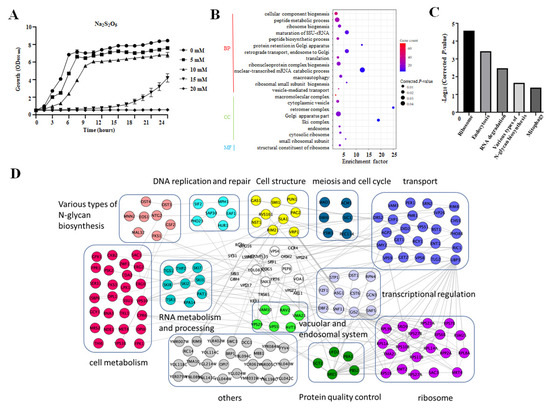 Identification of Na2S2O5-sensitive mutants by genome-wide screen. (A) Growth curve of BY4741 in YPD medium with different concentrations of Na2S2O5. (B) GO term analysis for the 162 genes for which deletion results in Na2S2O5 sensitivity. BP, biological process; CC, cellular component; MF, molecular function. (C) KEGG analysis for the 162 genes for which deletion results in Na2S2O5 sensitivity. (D) Physical interactions of the 162 Na2S2O5-sensitive genes. These genes were classified into 12 groups. The node colors indicate different functions. Genes in the white group were not in our list.