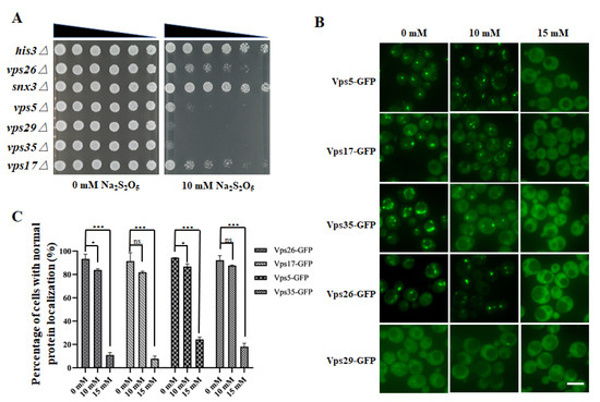 Considering the essential roles of the retromer complex in Na2S2O5 tolerance, we speculated that Na2S2O5 might cause cytotoxicity through influence of the functions of this complex. According to the data in the Yeast GFP Fusion Localization Database (https://yeastgfp.yeastgenome.org/) (accessed on 12 December 2021), proteins in the retromer complex are localized on the endosome or the vacuolar membrane [23]. In order to investigate whether Na2S2O5 treatment had any effect on the retromer complex, fluorescence microscopy was used to observe the localization changes of the retromer complex-related proteins (Vps26, Vps29, Vps35, Vps5, and Vps17) after Na2S2O5 treatment, which is a prerequisite for normal retromer functions. Strains with chromosomal C-terminal GFP-tagged proteins were obtained from the commercial Yeast GFP Clone Collection (www.invitrogen.com/clones) (accessed on 12 December 2021) [23]. Vps26, Vps5, and Vps17 were mainly localized on the endosome, and in our study, under normal conditions, Vps26-GFP, Vps5-GFP, and Vps17-GFP were accumulated in bright punctate structures as expected [32]. When exposed to 10 mM Na2S2O5, their localization did not seem to change. However, under 15 mM Na2S2O5 treatment, their localization appeared to be altered (Figure 2B). Likewise, Vps35 was reported to localize on the endosome and the vacuolar membrane [23], and, consistent with this, Vps35-GFP localized to bright puncta and vacuolar rim-like structures in the medium without Na2S2O5. However, when treated with 15 mM Na2S2O5 medium, Vps35-GFP was mislocalized to the cytoplasm (Figure 2B). The localization of Vps29-GFP was ambiguous under normal conditions [23], and thus it was difficult to discern the changes in its localization (Figure 2B). We quantified the cells with normal protein localization before and after Na2S2O5 treatment, and found that more than 90% of the cells displayed normal retromer complex localization in YPD medium (Figure 2C). When exposed to 10 mM Na2S2O5, the proportion of cells with correct protein localization did not change or only slightly changed; while subjected to 15 mM Na2S2O5, about 80% of the cells displayed mislocalized protein (Figure 2C). This pattern was reminiscent of the growth curve in Na2S2O5, in which, when growing in 10 mM Na2S2O5, only slight changes were observed, whereas when growing in 15 mM Na2S2O5, dramatic changes were displayed (Figure 1A). Alterations in retromer complex localization seemed to be correlated with dramatic growth defects in the yeast when exposed to 15 mM Na2S2O5, which implies that defects in cell growth might be due to the mislocalization and potential misfunction of the retromer complex.