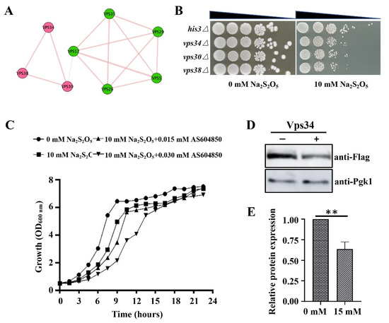To obtain further evidence on the central roles of endosomal PI3P on Na2S2O5 tolerance, AS604850, a chemical inhibitor of Vps34, was used to inhibit PI3P synthesis through disruption of Vps34 functions [41,42]. We found that after inhibition of PI3P synthesis by adding AS604850, yeast showed a significantly increased sensitivity to Na2S2O5 in comparation with the group with no added inhibitor (Figure 3C). Taken together, these results indicate that the PI3K complex II-related genes VPS30, VPS38, and VPS34 were needed for yeast to survive in Na2S2O5, and that PI3P is a potential signaling molecule mediating the yeast Na2S2O5 tolerance response.