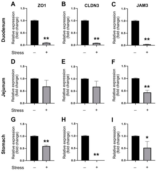 Relative mRNA expression levels of tight junction genes. Through qRT-PCR analysis, the relative mRNA expression levels of tight junction genes ZO-1 (A,D,G), CLDN3 (B,E,H), and JAM3 (C,F,I) and of the mouse duodenum (A–C), jejunum (D–F), and stomach (G–I) with or without 9 h of restraint stress. The mRNA expression levels of the control (no stress) groups were normalized to 1-fold. n = 3 (2 experiments with a total of 3 mice per group). * p < 0.05 and ** p < 0.01 vs. their respective no stress control groups. The “stress −“ indicates no stress control groups and the “stress +” indicates the stressed groups.