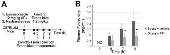 Proton pump inhibitor (PPI) rescues stress-induced GI leakage. (A) Experiment outline of PPI esomeprazole treatments in the restraint stress mouse model. (B) Plasma Evans blue levels of stressed mice with or without esomeprazole treatments at 0, 5, 7, and 9 h. Error bars show the standard deviation; * p < 0.05 and ** p < 0.01 vs. their respective control groups without esomeprazole treatments. ND: not detected. n = 6 (3 experiments with a total of 6 mice per group).