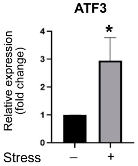Relative duodenal mRNA expression levels of the ATF3 gene in WT mice. Through qRT-PCR analysis, the relative mRNA expression levels of the ATF gene of the mouse duodenum with or without 9 h of restraint stress. The mRNA expression levels of the control (no stress; stress−) groups were normalized to 1-fold. Error bars show the standard deviation. n = 3 (2 experiments with a total of 3 mice per group). * p < 0.05 vs. no stress control groups. The “stress −“ indicates no stress control groups and the “stress +” indicates the stressed groups.