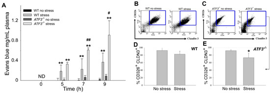 An ATF3 deficiency exacerbates stress-induced GI injuries and claudin 3 (CLDN3) suppression. (A) Plasma Evans blue levels of WT (WT) and ATF3 gene knockout (KO; ATF3−/−) mice with or without stress at 0, 5, 7, and 9 h. (B,C) Flow cytometry analysis of tight junction protein CLDN3 expressing gut epithelial (CD326+/CLDN3+ double positive) cells in WT (B) and ATF3−/− (C) mice. (D,E) The quantitative results of flow cytometry CD326+/CLDN3+ populations in WT (D) and ATF3−/− (E) mice are indicated. (A) # p < 0.05 and ## p < 0.01 vs. their respective WT groups and (A–E) * p < 0.05, ** p < 0.01 vs. no stress groups; error bars show the standard deviation. (A) n = 6 (3 experiments with a total of 6 mice per group) and (B–E) n = 4 (2 experiments with a total of 4 mice per group).