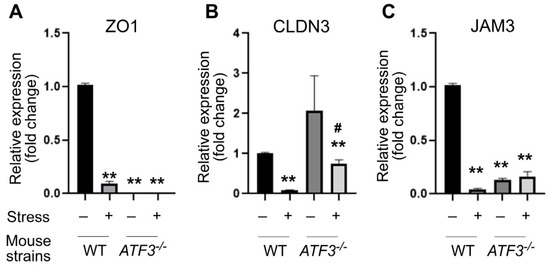 Relative duodenal mRNA expression levels of tight junction genes in WT and ATF3−/− mice. Through a qRT-PCR analysis, the relative mRNA expression levels of tight junction genes ZO-1 (A), CLDN3 (B), and JAM3 (C) of the mouse duodenum with or without 9 h of restraint stress. The mRNA expression levels of the control (no stress; stress-) groups were normalized to 1-fold. n = 3 (2 experiments with a total of 3 mice per group). Error bars show the standard deviation; ** p < 0.01 vs. the respective no stress WT control groups and # p < 0.05 vs. the respective no stress ATF3−/− control groups. The “stress −“ indicates no stress control groups and the “stress +” indicates the stressed groups.