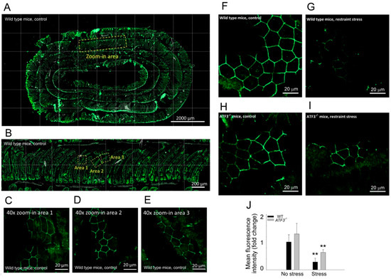 Confocal microscopy of immunohistochemistry (IHC) CLDN3 staining. Tissue section IHC of a Swiss-rolled duodenal sample was stained with a fluorescence-labeled anti-CLDN3 antibody. (A) A representative image at low magnification is presented. (B) The yellow boxed zoomed-in area in (A) is enlarged as a higher magnification view. (C–E) Areas 1, 2, and 3 in (B) are further enlarged to observe the detailed expression patterns of CLDN3 in the villi of the duodenal tissue. (F–I) The CLDN3 staining in the WT mice (F,G) was compared to ATF3−/− mutants (H,I) without (F,H) or with (G,I) restraint stress. (J) The quantitative results are obtained from 3 images at various areas; ** p < 0.01 vs. the respective no stress groups. (J) The averaged mean fluorescence intensity of the WT no stress groups was normalized to 1-fold. (A–G) WT mice and (H,I) ATF3−/− mutants. Scale bars: 2000 μm (A), 200 μm (B), and 20 μm (C–I). Error bars show the standard deviation.