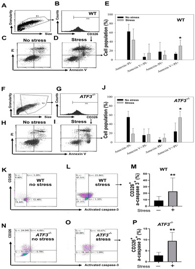 Flow cytometry results of restraint stress-induced GI cell death. (A–E) Analyses of WT mouse samples. The gating (A,B) and analysis (C,D) of CD326+/PI+/annexin V+ dead duodenal epithelial cells from mice without (C) or with (D) restraint stress, and the quantitative results (E) are revealed. (F–J) Analyses of the ATF3−/− mouse samples. The gating (F,G) and analysis (H,I) of CD326+/PI+/annexin V+ dead duodenal epithelial cells from mice without (H) or with (I) restraint stress, and the quantitative results (J) are indicated. (K–P) Relative levels of CD326+/activated-form caspase-3+ (a-caspase 3+) apoptotic epithelial cells in WT (K–M) and ATF3−/− (N–P) mice with or without stress are revealed (gating in (K,L,N,O)). (M,P) The quantitative results are indicated. n = 5 (2 experiments with a total of 5 mice per group). (E,J,M,P) * p < 0.05 and ** p < 0.01 vs. their respective no stress control groups. Error bars show the standard deviation. The “stress −“ indicates no stress control groups and the “stress +” indicates the stressed groups.