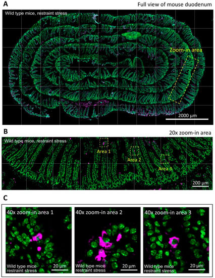 After 9 h of stress, the duodenum samples (6 cm; begins immediately after the pyloric portion of the stomach, PBS-washed) were collected and rinsed with 1 mL of ice-cold PBS 3 times and Bouin’s reagent (1 mL, 50% ddH2O, 45% absolute ethanol, and 5% acetic acid) 2 times through the opening of the duodenum. The duodenum was then cut open longitudinally using a surgical blade and washed an additional 2 times with PBS. It was then bisected along its length and Swiss-rolled with a toothpick [53]. Once the entire length of the intestine had been rolled, a pair of forceps was used to remove the rolled tissue from the toothpick, and the tissue was kept in a tissue-embedding cassette in 10% buffered formalin for more than 30 min for fixation. The rolled tissue was then placed in the organic solvents overnight for dehydration. The dehydrated tissue was then placed in a metal cassette and filled with hot wax. It was cooled until the wax solidified, and the metal cassette was removed. Following the standard protocols of paraffin embedding, removal, antigen retrieval, washes (TBS buffer), and protein blocking (5% BSA) were conducted [33,54], and the sectioned tissues were subjected to immunofluorescent staining.