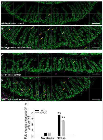 Relative activated-form caspase 3 staining signals in WT and ATF3−/− mice after stress. The WT mice (A,B) was compared to ATF3−/− mice (C,D) without (A,C) and with (B,D) restraint stress. (E) The quantitative results of activated-form caspase-3+ (a-caspase 3+) apoptotic epithelial cells and villi were obtained from three images at various areas. ** p < 0.01 vs. the respective no stress groups. Scale bars: 200 μm (A–D). Error bars show the standard deviation.
