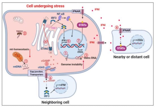 Activation and propagation of the cGAS-STING signaling by cytosolic self-DNA. Release of DNA from the nucleus and mitochondria as well as release of retroelement RNA molecules (Retro RNA) into cytoplasm in cells undergoing stress (1) can exceed the capacity of TREX 1 to clear cytosolic DNA (2). This will activate cGAS and the synthesis of the secondary messenger cyclic dinucleotide cGAMP (3) that binds to STING and results in its transport from the ER to the Golgi (4) subsequently leading to the production of Type I interferons (IFNI) (5). cGAMP can move into the neighboring cells through GAP junctions and specific cGAMP translocators and activate IFNI genes there (6). IFNIs subsequently activate the expression of interferon stimulated genes (ISGs) via paracrine and endocrine activation of specific IFNI membrane receptors (IFNAR) on the infected (7) as well as uninfected nearby and distant cells (8) that collectively promote the innate and adaptive defense responses. Red filled circles, IFNI. The Figure was created in BioRender.