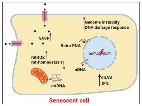 cGAS-STING activity appears to underlie key senescence phenotypes, in part, as a result of release of chromosome fragments into cytoplasm due to the disruption of the nuclear envelope integrity in the senescent cells [154,155]. Cytosolic DNA molecules derived from retroelements elicit inflammatory responses [17]. In senescent cells, retrotransposable elements become transcriptionally activated. Thus, increased cytosolic LINE-1 cDNA may be a source of cGAS-STING activation in senescent cells [86]. Moreover, age-associated decline in mitotic fidelity gives rise to micronuclei formation, SASP expression, and cellular senescence [76]. Thus, cellular senescence reflects the axis of genome instability, misplaced cytosolic self-DNA, and inflammation, in the aging process (Figure 2).