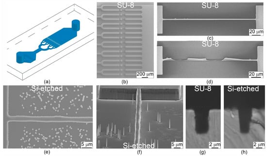 Microfluidic device for mimicking microcapillaries of the circulation system: (a) schematic view; (b) total view of 16 microchannels on the SU-8 mold; (c) example of a SU-8 microchannel on the new mold; (d) example of a SU-8 microchannel after three months of usage; (e) top view and (f) side view of a channel on the Si-etched mold; (g) cross section of a PDMS replica fabricated with SU-8 mold; (h) cross section of a PDMS replica fabricated with Si-etched mold. All images were obtained by scanning electron microscope.