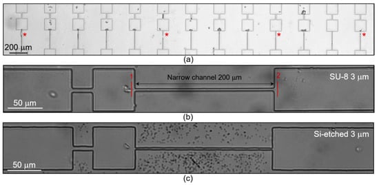Both molds were used to fabricate several dozens of PDMS microfluidic devices for experimental studies. After that, they were inspected for changes щa the size of the microchannels. On the silicon mold, the channels did not change their size and shape, while more than 50% of the microchannels 1.5 and 2 µm wide on the SU-8 mold were damaged (see Figure 1d). It happened since SU-8 is an epoxy-based photoresist, which elasticity is much lower than the elasticity of silicon []. In addition, the adhesion of the SU-8 layer to the silicon wafer might have an important influence on the destruction process. The heating/cooling of the mold during the PDMS curing process and further replica detachment increased the deformation and damage of the microstructures on the mold.