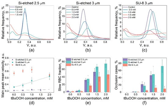 Velocities of RBCs exposed to oxidative stress in different microfluidic channels: (a) rough 2.5 μm wide microchannels made with the Si-etched mold; (b) rough 3 μm wide microchannels made with the Si-etched mold; (c) smooth 3 μm wide microchannels made with the SU-8 mold; (d) the main peak mean velocity according to the tBuOOH concentration; (e) slow RBCs fraction ratio according to tBuOOH concentration. (f) Percentage of occlusions cases in microchannels of different widths and roughness. All data are presented as mean ± SE.