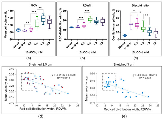 Hematological analysis of erythrocytes exposed to oxidative stress caused by tBuOOH show: (a) increase of mean cell volume; (b) increase heterogeneity of the population by volume; (c) decrease of low angle light scattering oscillations indicating increase in RBCs spherization. * p < 0.05; ** p < 0.01; *** p < 0.00; 2-tailed independent samples, t-test, n = 14 donors. (d) The relationship between the RBCs mean velocity in microchannels and the indicator of the heterogeneity of the RBC population by volume, RDW% in 2.5 µm-wide channels and (e) in 3 µm-wide channels; RDW%—hematological analyzer data; the dashed field shows the values for RDW% and mean velocity of untreated by tBuOOH cells.