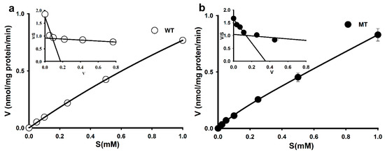 Additional analysis using an Eadie–Hofstee plot yielded two distinct slopes (Figure 1a,b, inset graph), indicating that two saturable components were involved in arginine uptake in WT and MT cell lines. The Michaelis–Menten constant (Km) and maximum uptake rate (Vmax) were fitted to the Equation (1), and at the high-affinity site, the affinity (Km) was 23-fold lower and the capacity (Vmax) was approximately 40-fold higher in the MT cell lines than in the WT cell lines. However, at the low-affinity site, both affinity and capacity in the MT cell lines did not markedly differ from those in the WT cell lines (Table 1).