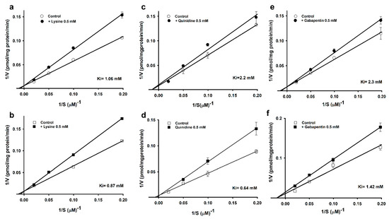 Furthermore, in our study, the Lineweaver–Burk plot demonstrated high-affinity uptake at varying L-arginine concentrations (5–50 µM) in the presence or absence of 500 µM lysine, quinidine, and gabapentin. In the case of lysine, the two lines of the plot intersected at the ordinate, indicating that lysine competitively inhibited L-arginine (Figure 2a,b).