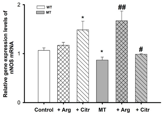 To assess the pattern of nNOS levels, we measured mRNA expression using qPCR in WT and MT cell lines, with or without the addition of arginine and citrulline. nNOS mRNA expression was lower in the MT cell lines than in the control; however, nNOS relative gene expression significantly increased in MT cell lines treated with arginine and citrulline, in comparison to untreated MT cell lines. In the WT cell lines, there was no statistical difference in the mRNA expression between the untreated and arginine-treated cells. In contrast, citrulline treatment resulted in a significant increase in nNOS expression compared with that in untreated WT cell lines (Figure 3).