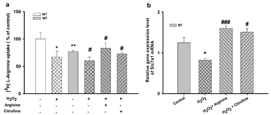 Pretreatment effect of oxidative stress-inducing H2O2 on [3H]L-arginine uptake by ALS cell lines. ALS cell lines were exposed to 100 µM H2O2 for 24 h. (a) [3H]L-Arginine uptake was measured at pH 7.4 and 37 °C for 5 min in WT and MT cell lines pretreated with H2O2 with or without treatment with 10 mM L-arginine and L-citrulline. (b) mRNA expression level of Slc7a1 in the MT cell line. Each value represents the mean ± SEM (n = 3–4). * p < 0.05, ** p < 0.01, significant differences vs. control; # p < 0.05, ### p < 0.001, vs. H2O2 treatment.