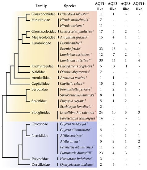 Evolutionary distribution of the annelid Aqps identified in this study, based on amino acid data. Annelid phylogenetic tree derived from the work in [31] and was combined with the Clitellata tree adapted from in [59]. Annelids belonging to Errantia are in blue (below) while families belonging to Sedentaria are in orange (above). Aqp classification according to phylogenetic relationship recovered in Figure 2. Letters following the species indicate the source of the analyzed data: G = genome; T = transcriptome; P = protein.