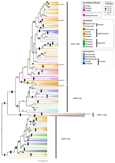 A collapsed version of our Aqp phylogenetic reconstruction of metazoans is shown in Figure 2, whereas fully annotated and midpoint-rooted trees are provided in the Supplementary Materials (Figures S1 and S2). This tree recognizes three well-supported clades, named AQP3-like, AQP8-like and AQP11-like, in accordance with the vertebrate AQPs they contain, and the nomenclature of Soto and coworkers [18]. A fourth clade, named AQP1-like, is marginally supported only by the Bayesian tree. Excluding the AQP11-like group, the phylogeny of each Aqp main group generally reflects the current metazoan tree [60,61], with poriferans and cnidarians as sister groups of Bilateria, and Xenacoelomorpha as sister group of Nephrozoa (i.e., bilaterians with nephridia). The latter is divided into two clades: Protostomia, with annelids, mollusks, bryozoans and brachiopods branching within Lophotrochozoa, and Deuterostomia (Figure 2). No Aqp genes were retrieved in 11 of the 27 additional metazoan phyla analyzed here (i.e., Ctenophora, Chaetognata, Gnathostomulida, Micrognathozoa, Gastrotricha, Phoronida, Entoprocta, Cycliophora, Rhombozoa, Nematomorpha and Loricifera, see Supplementary Table S2).