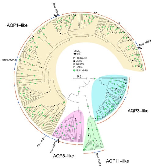The final trees were edited with FigTree 1.4 [53]. In accordance with previous phylogenetic analyses, these trees were re-rooted using aquaglyceroporins, also named AQP3-like clade, which formed a highly supported monophyletic group [13,54].