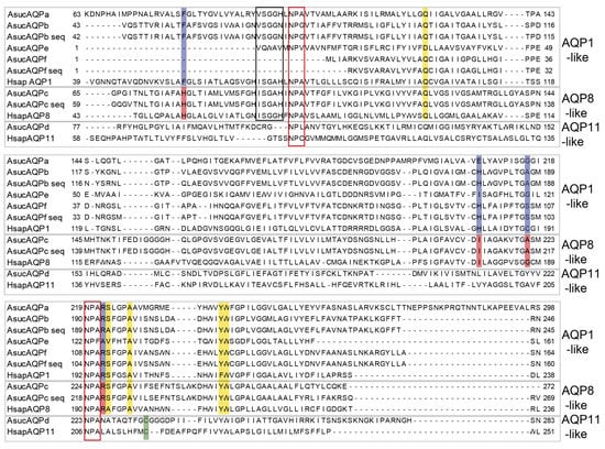 Multiple alignment of the Alitta succinea Aqps (Table 1) and human (Hsap) AQP1 (P29972), AQP8 (XP_011544124.1) and AQP11 (Q8NBQ7). The “seq” suffix marks sequences obtained by RT-PCR, cloning and sequencing. In red boxes the two NPA motifs. The black box indicates the ISSGH motif, typical of the AQP1-like clade. The ar/R regions of both AQP1-like and AQP8-like clades are shaded in blue and red, respectively. The Cys residue down in the C-terminus NPA boxes of the AQP11-like clade is shaded in green. Positions P1–P5 of the AQP1-like clade are shaded in yellow.