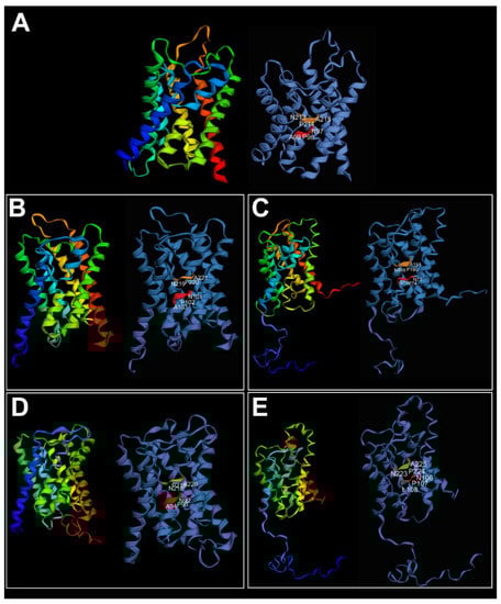 Three-dimensional structure of (A) Homo sapiens AQP4 (PDB ID: 3GD8) used as template; (B) AsucAQPa; (C) AsucAQPb; (D) AsucAQPc; (E) AsucAQPd. On the left, AQP structures colored in rainbow indicate N to C termini, from blue to red. On the right, NPA motifs are indicated in red and orange. The three-dimensional structure was predicted only for AsucAQPs with complete or almost complete coding sequences.